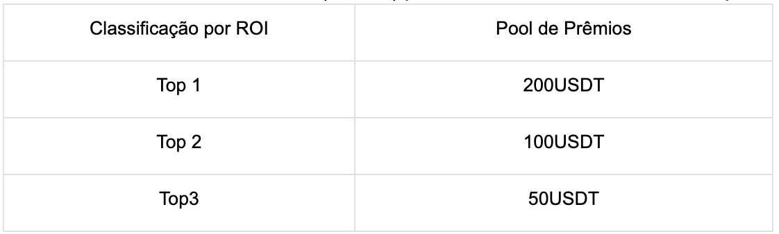 Classificaremos o rendimento anualizado do usuário durante todo o período da competição, e os 3 principais usuários que atenderem aos requisitos acima no rendimento anualizado final durante 9 de dezembro de 2022 - 15 de dezembro de 2022 18:00:00 (UTC+8) podem receber um valor fixo recompensa da seguinte forma: