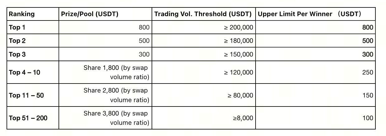 Durante o evento, os utilizadores com um volume acumulado de negociação Swap ≥8 000 USD em cadeias compatíveis com EVM são elegíveis para rankings escalonados. Caso o limiar de volume de negociação para uma classificação específica não seja atingido, o respetivo prémio ou prize pool não será distribuído.