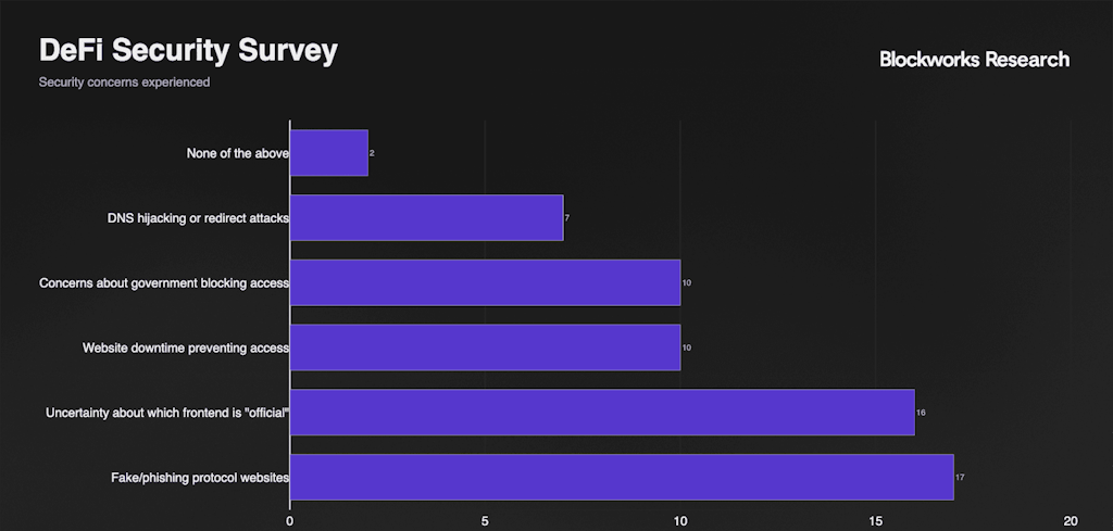 Os dados do inquérito confirmam a consciência dos utilizadores quanto a estas ameaças. Entre os inquiridos, 88% identificam a ligação a sites maliciosos como a sua principal preocupação, em comparação com 77% que referem vulnerabilidades em smart contracts. Estes resultados mostram que o mercado reconhece que os ataques ao frontend são um vetor de ameaça significativo.