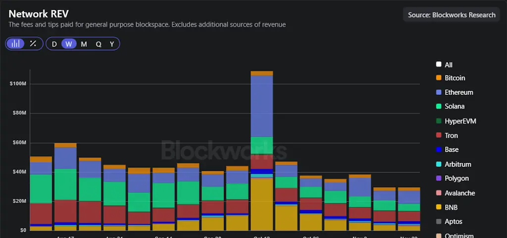 A REV da rede semanal tem-se saído ainda pior, com os dois últimos registos (ambos em torno de $29,5 milhões), o valor mais baixo desde 2022. A Ethereum ficou em primeiro lugar ($8,9 milhões), posição que tem alternado nas últimas semanas. A Solana mantém-se em terceiro com $5,1 milhões (menos 15%) e a Tron em segundo com $6,3 milhões (menos 12,5%). A Solana foi líder do mercado em apenas uma das últimas sete semanas, depois de meses consecutivos na liderança.