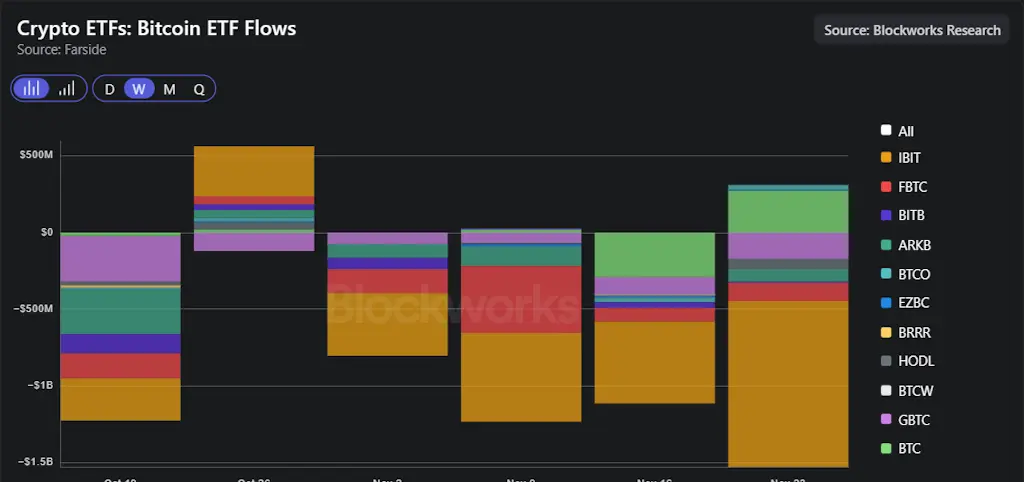 Nas últimas quatro semanas, os ETFs spot de bitcoin nos EUA registaram saídas líquidas consistentes, com cada um dos últimos três períodos semanais a ultrapassar $1 mil milhões em fundos retirados. A IBIT foi responsável pela maior parte dos resgates, mas saídas menores e estáveis também surgem em fundos como FBTC, BITB e ARKB. No geral, a tendência reflete um desinvestimento sustentado por parte dos investidores, com os resgates acumulados a intensificarem-se até ao final de novembro.