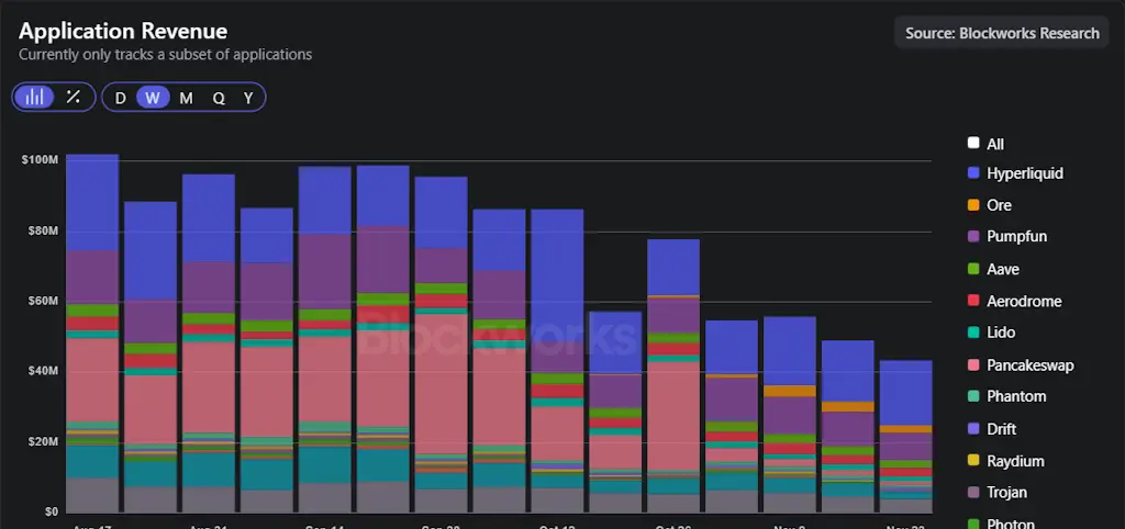 No geral, as receitas das aplicações caíram 11% em relação à semana anterior, de $49 milhões para $43,5 milhões—o valor semanal mais baixo desde março de 2025. A Hyperliquid continua a liderar em receitas de aplicações, com $18,5 milhões na última semana (mais 8%), seguida da pump.fun, que arrecadou $7,7 milhões (menos 22%). A Ore ocupou o terceiro lugar pela primeira vez, gerando $2,3 milhões na última semana.