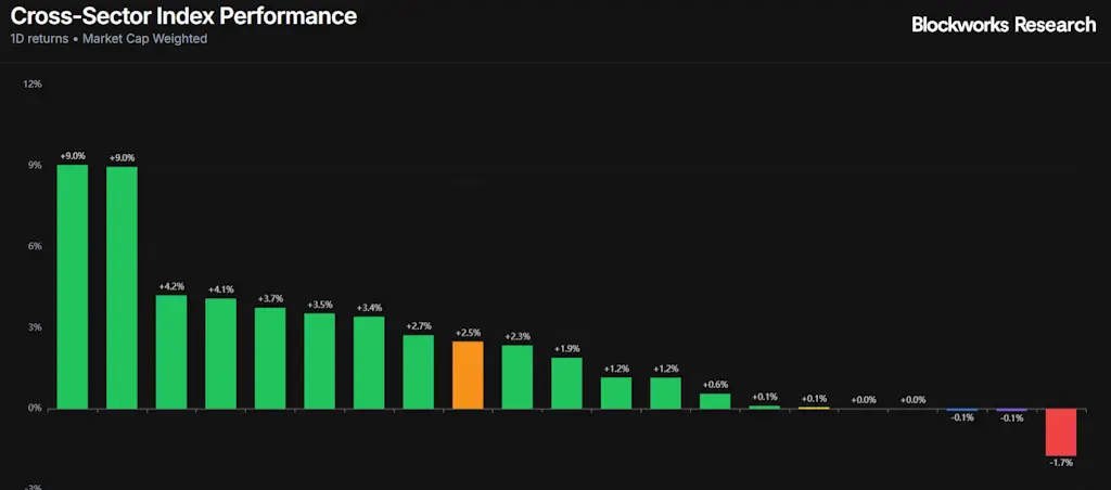 Os ativos de risco inclinaram-se ligeiramente para o risco, com o BTC (+2,5%) a apresentar um ganho estável enquanto as ações tradicionais ficaram para trás, com o S&P 500 (-0,1%) e o Nasdaq 100 (-0,1%) a caírem ligeiramente. O ouro (+0,1%) manteve-se praticamente estável, refletindo um pano de fundo macroeconómico atenuado. O tom geral foi construtivo, impulsionado principalmente pela força nos setores nativos das criptomoedas.