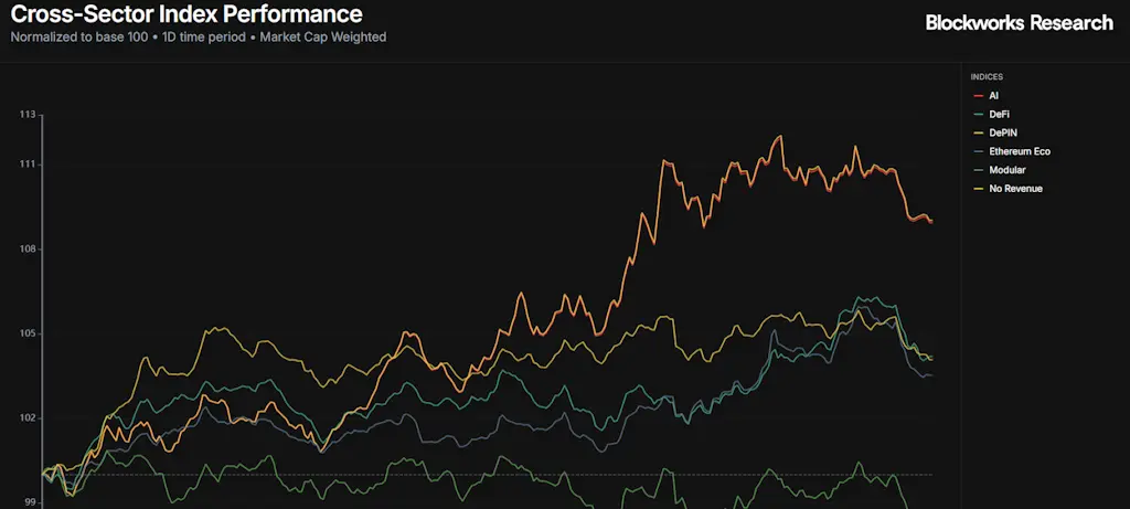 Nas últimas 36 horas, a amplitude do setor cripto foi notavelmente forte. DePIN (+9,0%) e AI (+9,0%) lideraram, dando seguimento ao seu momento de várias semanas, enquanto os investidores rodam para apostas temáticas de beta mais elevado. DeFi (+4,2%) seguiu juntamente com desempenhos sólidos dos ativos alinhados com o Ethereum (+3,5%). Pelo lado negativo, Modular (-1,7%) foi o único declínio significativo, marcando uma forte divergência numa onda maioritariamente verde.