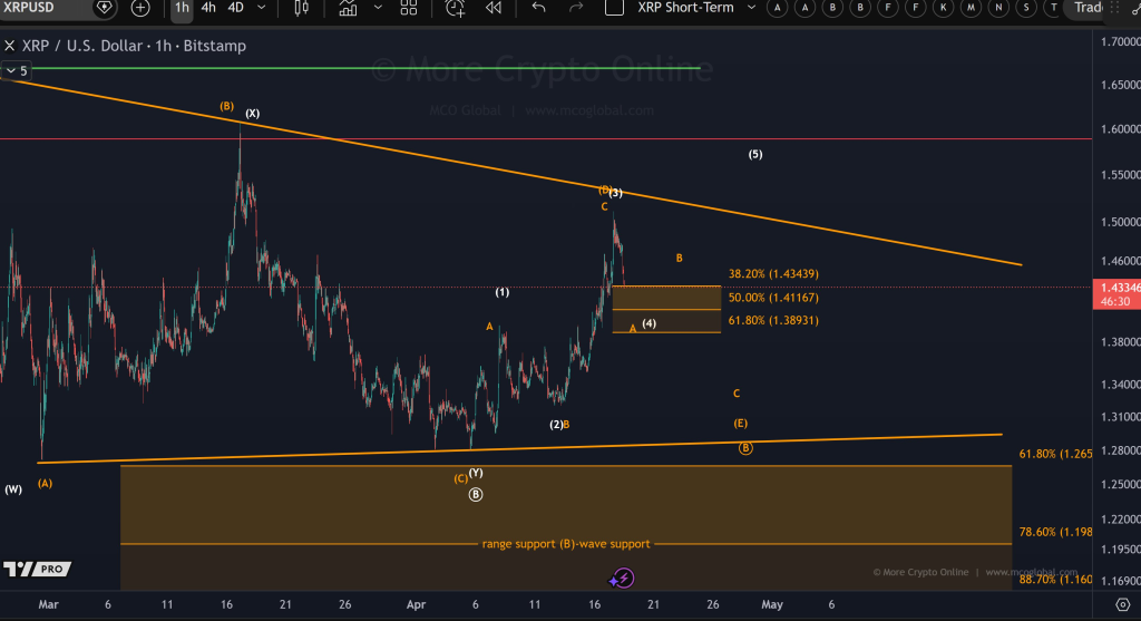 The attached 1‑hour chart shows XRP trading in a corrective structure. The analyst has labeled waves (A), (B), ©, (W), (X), (Y), and (E). The price recently completed a move up to the $1.50 area, marked as wave (B) or wave (X). Now the pullback is underway.