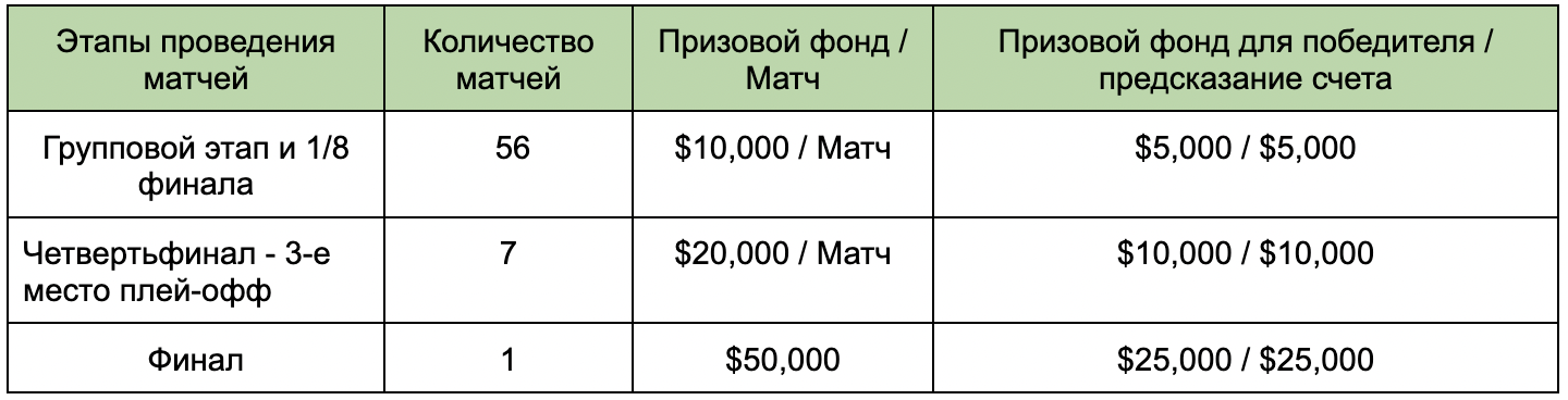 Всего в Кубке мира будет 64 игры, и мы приготовили для участников мега-призы на сумму $770 000! Подробности следующие: