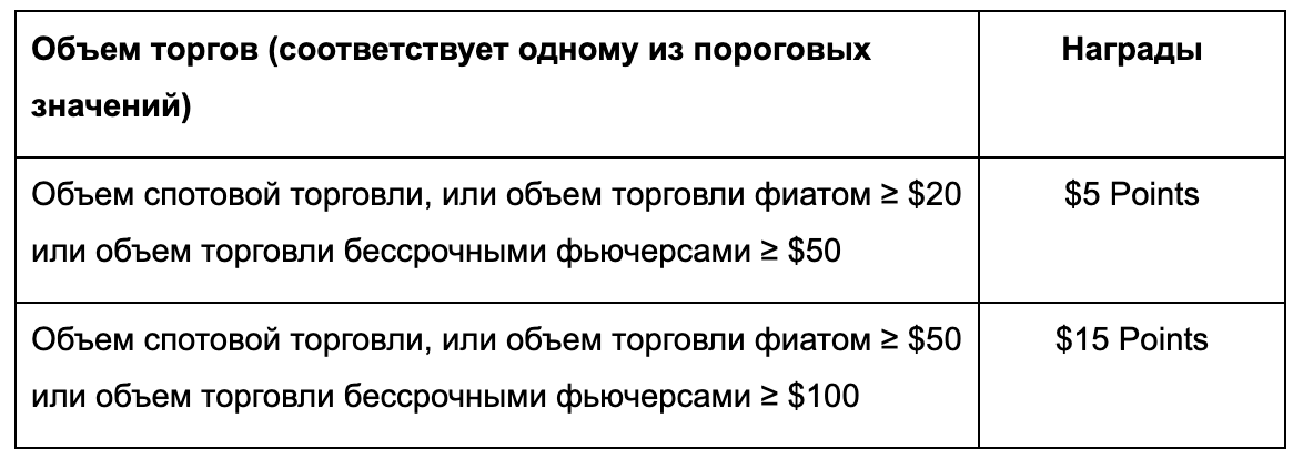 2. Объем торговли = покупки + продажи; спот-торговые пары должны находиться в торговой зоне USDT (пара BTC/USDT исключена); бессрочные фьючерсные торговые пары должны находиться в бессрочном контракте USDT-Margin.