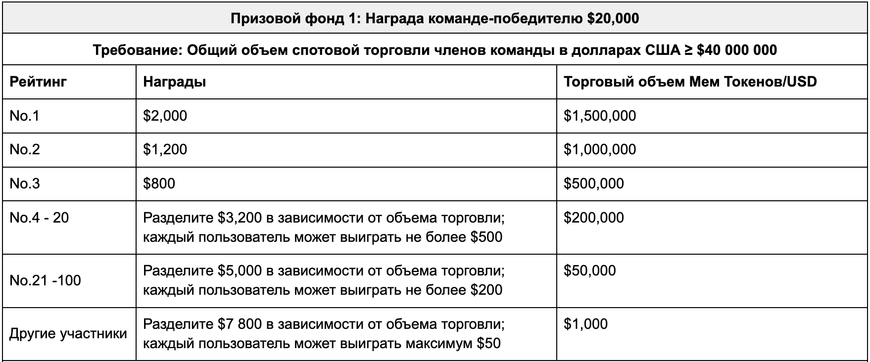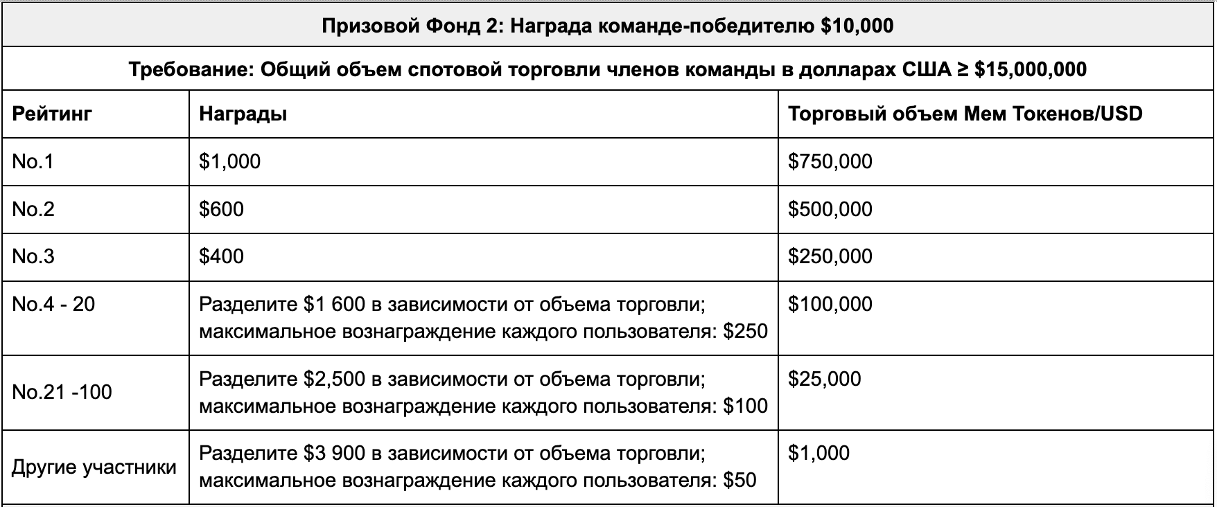 100 счастливчиков с любым объемом спотовой торговли упомянутыми выше мем токенами разделят между собой призы в размере $1 000 в зависимости от объема их торговли.