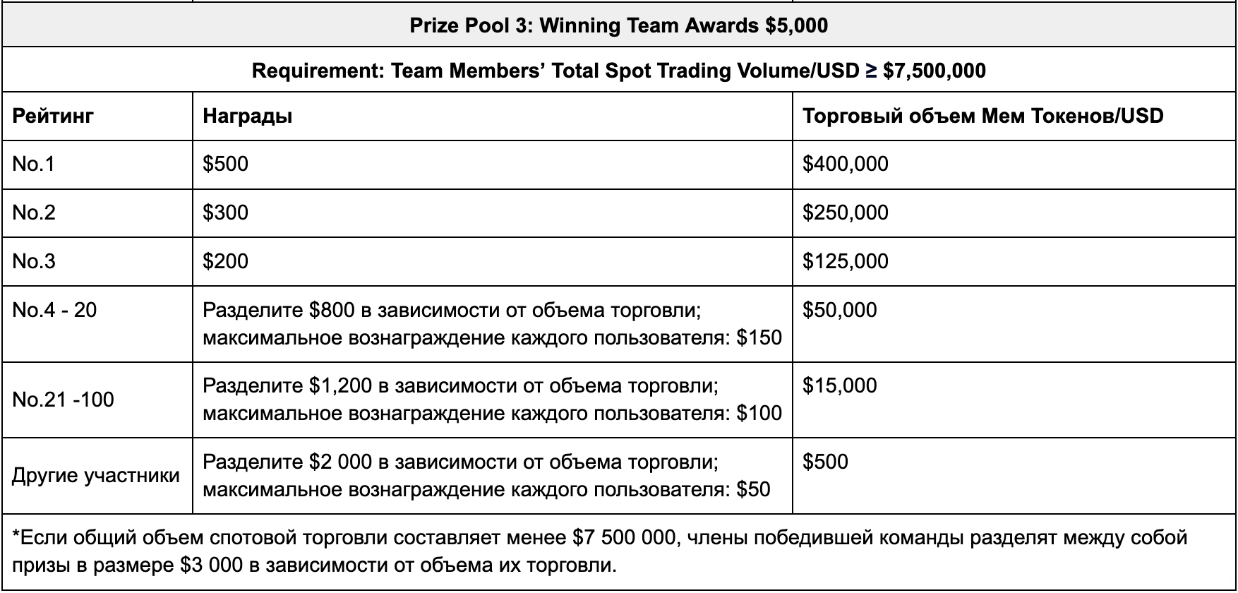 3. Правила разблокировки призового фонда: члены команды могут совершать спот-торговлю только теми монетами-мемами, которые указаны в их команде.