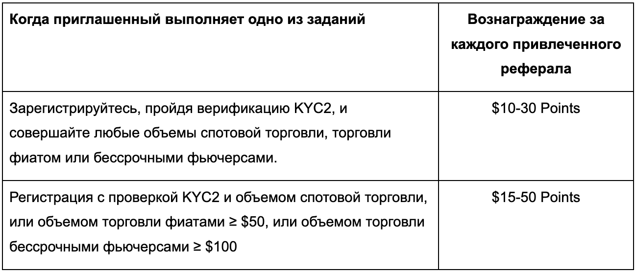 Пригласите нового пользователя зарегистрироваться, пройдя верификацию KYC2 и выполнив задания, и получите вознаграждение и комиссию в размере до 40% от торговой комиссии за каждого приглашенного.