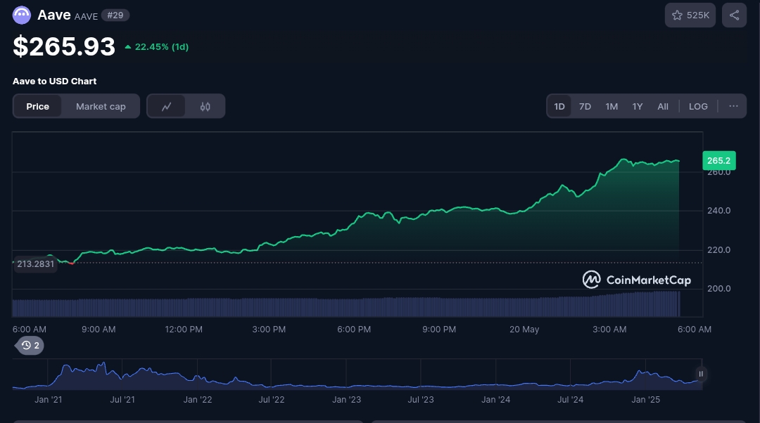 AAVE вырос почти на 95% с апреля, поднявшись до многомесячного максимума выше $260 на фоне сокращения предложения на бирже, возобновления активности в DeFi и renewed интереса инвесторов, особенно среди китов.