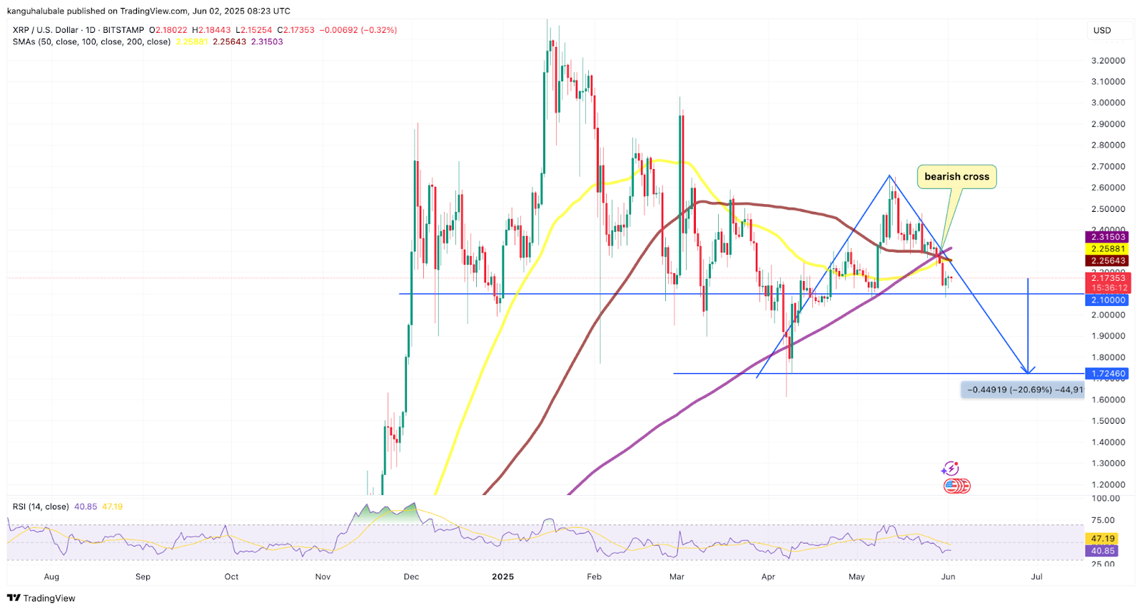 Цена XRP в настоящее время торгуется на 18% ниже пика мая на 2,65 доллара, и многие данные указывают на риск падения до отметки 1,7 доллара.