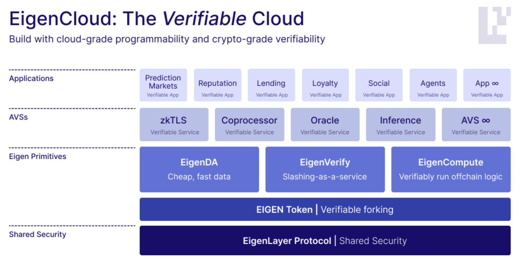 EigenCloud интегрирует такие инструменты, как EigenDA, EigenVerify и EigenCompute, а также позволяет пользователям ставить EIGEN для обеспечения безопасности и получения вознаграждений.