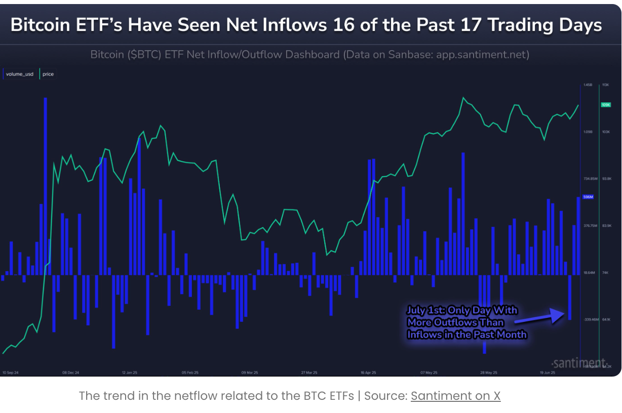 График показывает, что за последние 17 торговых дней Спот ETF на биткойн зафиксировал чистый приток средств в 16 дней. Единственное исключение произошло 1 июля, когда был зафиксирован отток средств.
