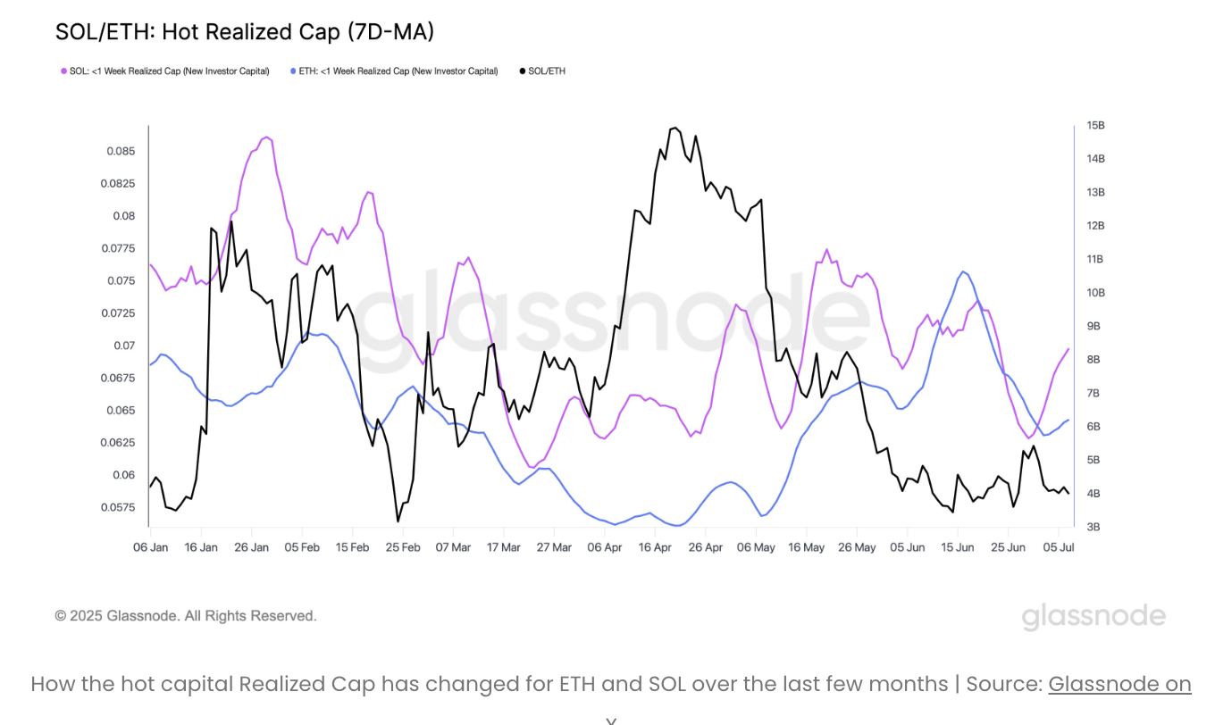 Данный график демонстрирует данные о «реализованной капитализации новых монет» (Realized Cap for coins aged less than 1 week) для Эфир (ETH) и Solana (SOL). Этот показатель измеряет объем нового капитала, поступившего в конкретную сеть за последнюю неделю.