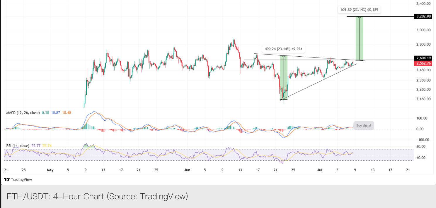 Ethereum (ETH) привлекает большое внимание со стороны компаний Уолл-стрит, которые настраивают свои криптоактивы на ETH, одновременно уменьшая свои запасы Биткойн (BTC). Появление этого институционального интереса совпадает с тем, что на графике ETH формируется бычий симметричный треугольник, что указывает на возможный рост цен на 20%, с целевым уровнем 3200 долларов. Данные Gate показывают, что на 9 июля цена торговли ETH составляет 2,593.08 долларов, за 24 часа увеличившись на 2.18%.