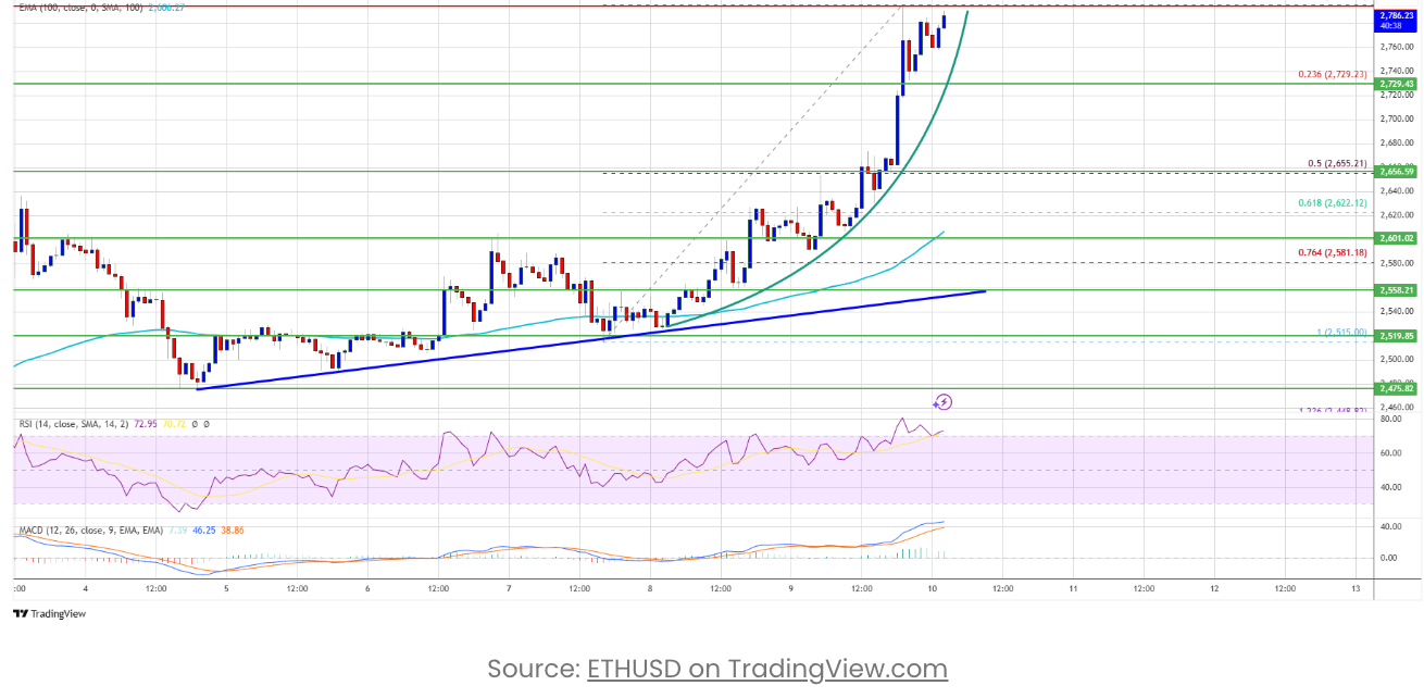 После достижения уровня сопротивления в 2800 долларов (максимум до 2795 долларов) цена Эфира вошла в этап консолидации, переваривая недавний рост. В настоящее время цена стабилизировалась выше 23.6% уровня Фибоначчи от волны роста между минимумом 2516 долларов и максимумом 2795 долларов. Более важно, что цена Эфира остается выше 2720 долларов и 100-часовой простой скользящей средней, краткосрочный тренд остается позитивным. На техническом графике часового графика ETH/USD видно, что важная параболическая линия тренда обеспечивает поддержку, находясь в районе 2750 долларов, что является важным индикатором для оценки краткосрочной динамики ETH.