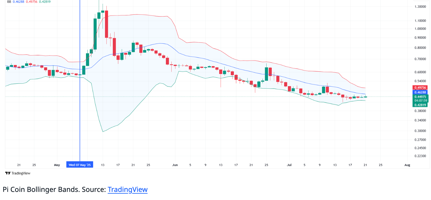 • Предупреждение о колебаниях сужающихся полос Боллинджера: Полосы Боллинджера на дневном графике резко сужаются, что предвещает значительные ценовые колебания. Исторические данные показывают, что в мае этого года, после появления аналогичной формации, токен Pi сразу же начал рост на 114%.
