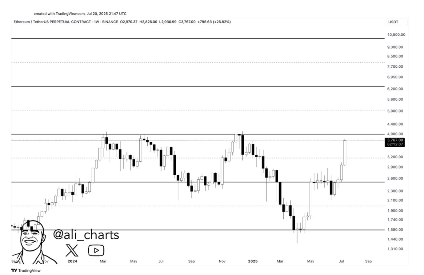 Прогноз цены Ethereum: ETH приближается к ключевому сопротивлению в 4000 долларов! Среднесрочная цель - 10000 долларов.