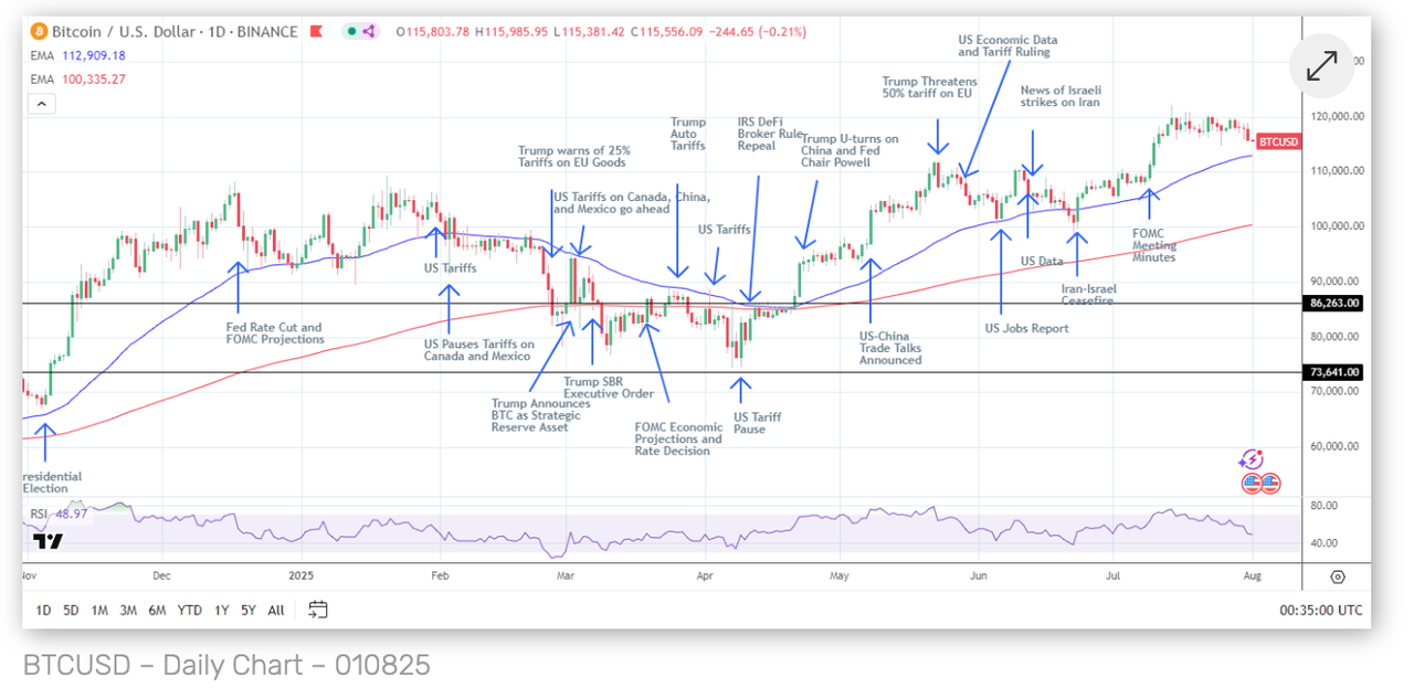 31 июля BTC упал на 1,69%, закрывшись на уровне 115,801 долларов, продолжив небольшое падение на 0,12% в среду.