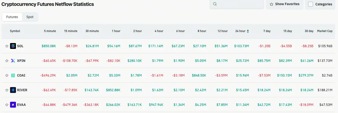 За последние 24 часа, $SOL, $XPIN, $COAI, $RIVER, $EVAA и другие контракты показали чистый отток, что создает торговые возможности.