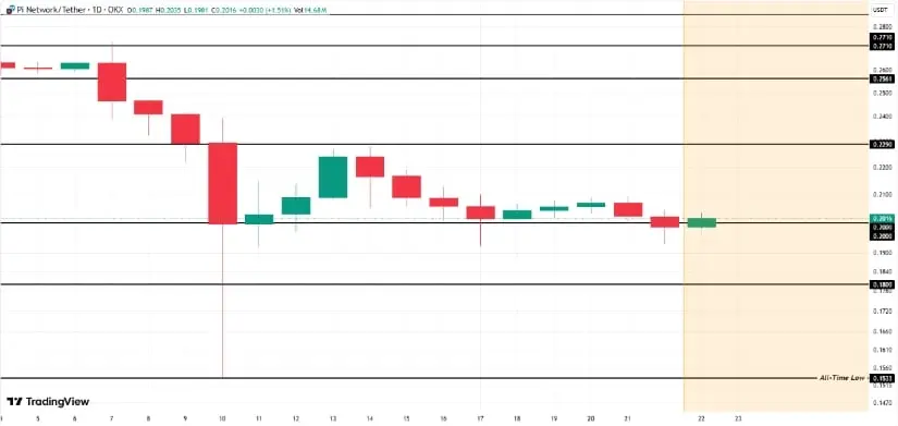 Токен Pi продолжает колебаться выше ключевого уровня поддержки 0.200 долларов, что отражает его устойчивость, несмотря на нарастающие медвежьи настроения. На момент написания статьи цена торговли Pi Network (PI) составляет около 0.203 долларов, и в течение последних двух недель она консолидировалась в узком диапазоне. Эта стабильная ценовая тенденция указывает на то, что покупатели продолжают защищать психологический уровень поддержки, ожидая потенциального отскока.