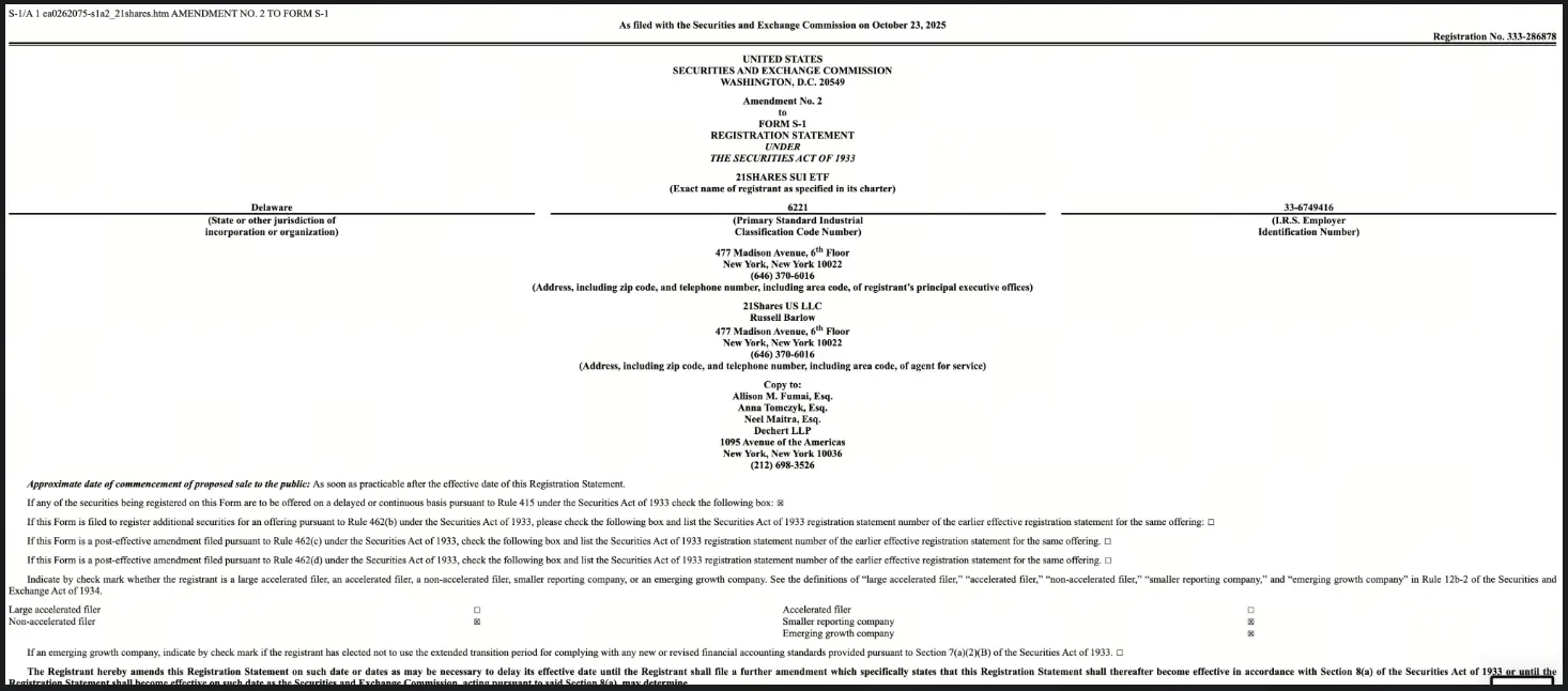 Ведущая в мире компания по управлению криптоактивами 21Shares обновила свои документы заявки на ETF SUI, четко включив положение о “застейкать награды” и раскрыв последние планы по листингу на Nasdaq. Это изменение знаменует переход крипто ETF в стадию, более ориентированную на доходность и Децентрализованные финансы, что может предоставить новые регуляторные ориентиры для других ETF на основе публичных блокчейнов.