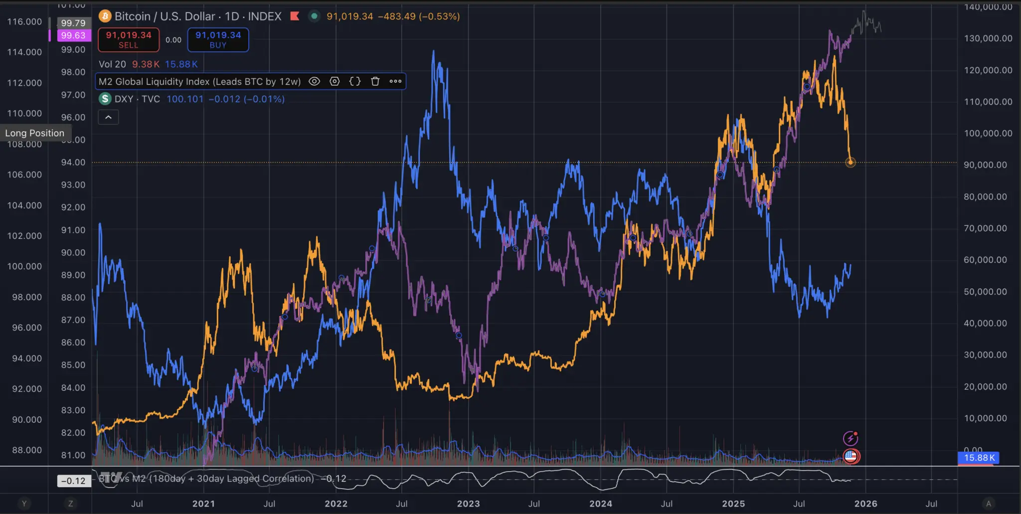 Bitcoin, nguồn cung tiền M2 (độ trễ 84 ngày) và đồng đô la kể từ năm 2020### Hai đồng hồ chính: thanh khoản và đồng USD