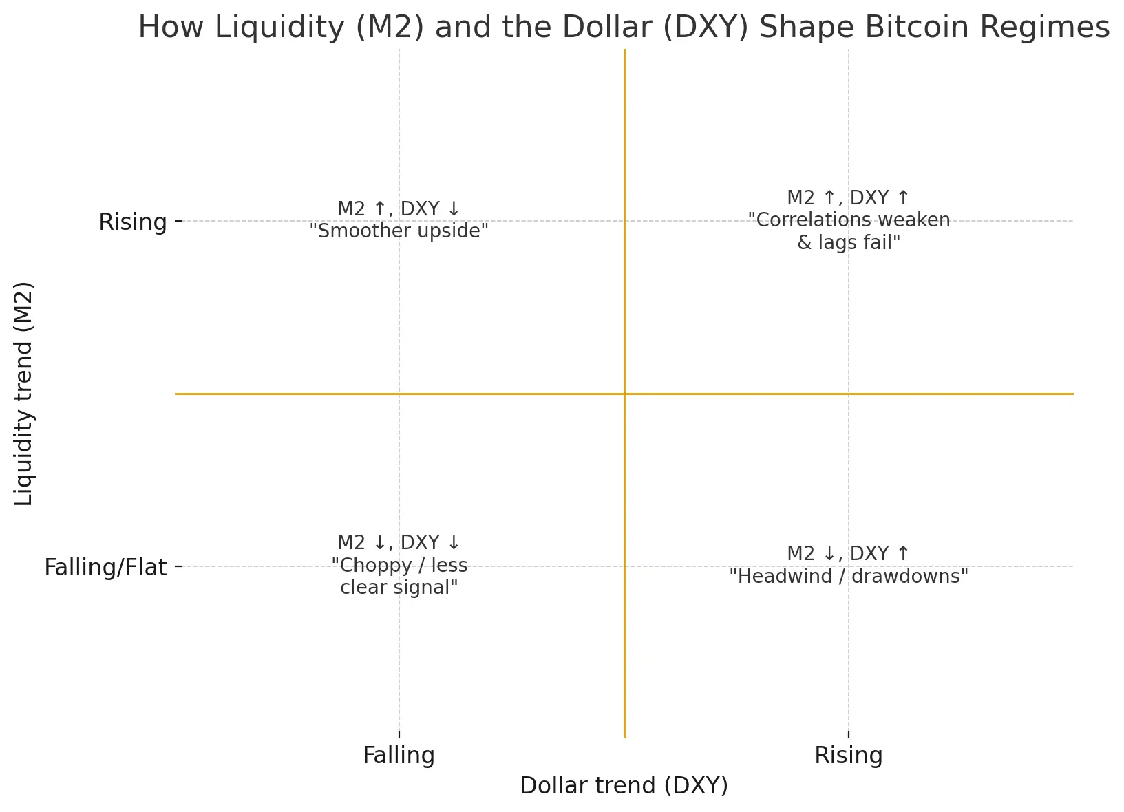 Theo dõi độ dốc của M2 và DXY trong khoảng 1–3 tháng theo log returns, không phải levels. Chỉ dựa vào M2 khi cả hai cùng thuận chiều.