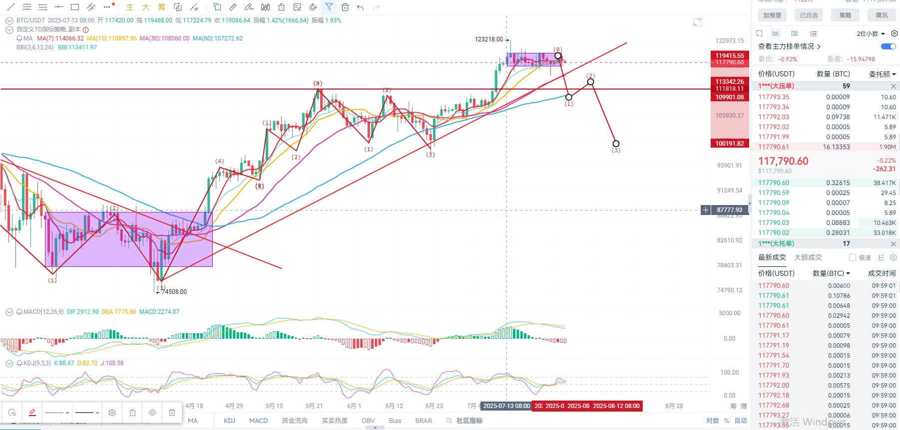 Радикальная стратегия: Если инвесторы предпочитают краткосрочные операции, можно вблизи уровня поддержки 117762.04 попробовать открыть небольшую длинную позицию, установив стоп-лосс ниже 116305.95, при этом обращая внимание на уровень сопротивления 119415.55 как на точку уменьшения длинных позиций. Если цена пробьет 116305.95 вниз, то можно рассмотреть возможность открытия небольшой короткой позиции, целясь на более низкую область поддержки.