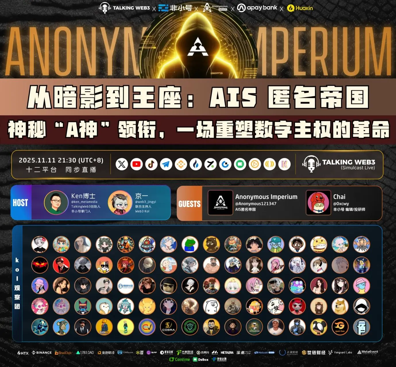 С развитием анонимной империи AIS (AIS Anonymous Imperium) в списке топ-100 лидеров мнений (KOL) начинается обратный отсчет. Этот прямой эфир организован в сотрудничестве с Feixiaohao, TalkingWeb3 и AIS Anonymous Imperium и будет транслироваться одновременно на платформах X, Binance Square, Binance Live, Huobi Live, Gate Live, Hotcoin Live, YouTube, Tiktok, Telegram, Pumpkin, Sidekick и других. Вновь внимание мира Web3 сосредоточено на этом “цифровом суверенном государстве”, созданном ведущими капиталами и технологическими гениями. Этот эфир не только впервые публично раскрывает стратегический план AIS, но и считается “преддверием решающей битвы” в истории Web3, где элита перестраивает цифровую идентичность и финансовый порядок.