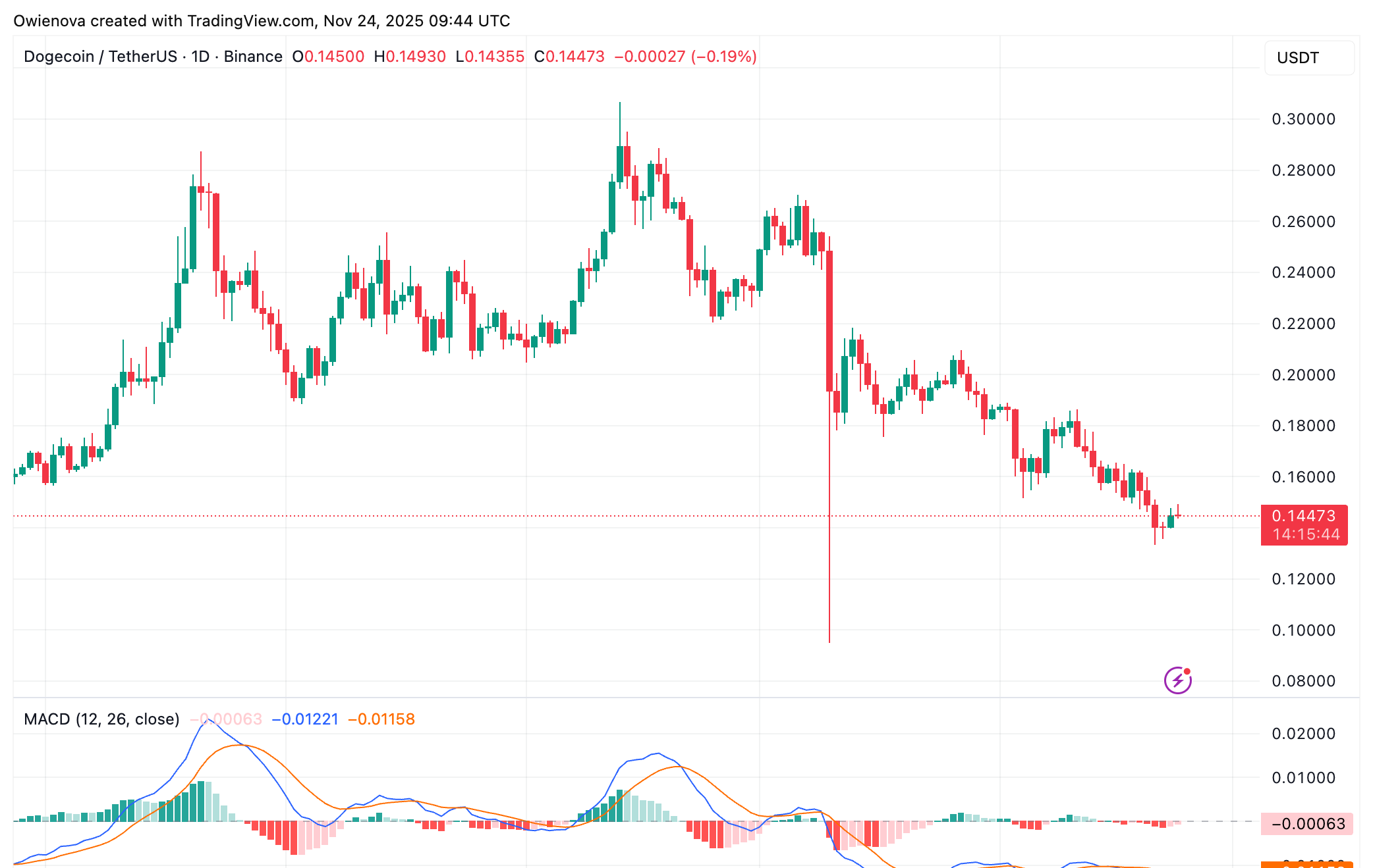 Догикоин теперь снова опустился в критическую зону поддержки около $0.14682, уровень, который ранее служил базой для ценовых реакций. Рынок демонстрирует ранние признаки стабилизации в этой области, что указывает на то, что покупатели начинают оценивать силу этой поддержки. Как DOGE будет себя вести здесь, может определить общее направление его следующего крупного движения.