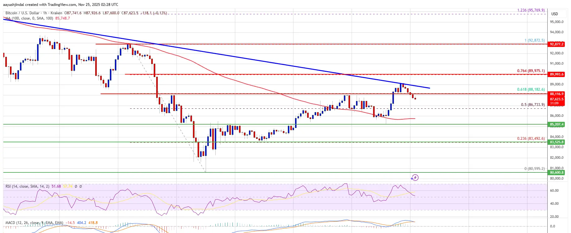 Кроме того, на часовом графике пары BTC/USD формируется нисходящая трендовая линия с сопротивлением на уровне $89,000. Биткойн сейчас торгуется выше $87,000 и 100-часовой простой скользящей средней.
