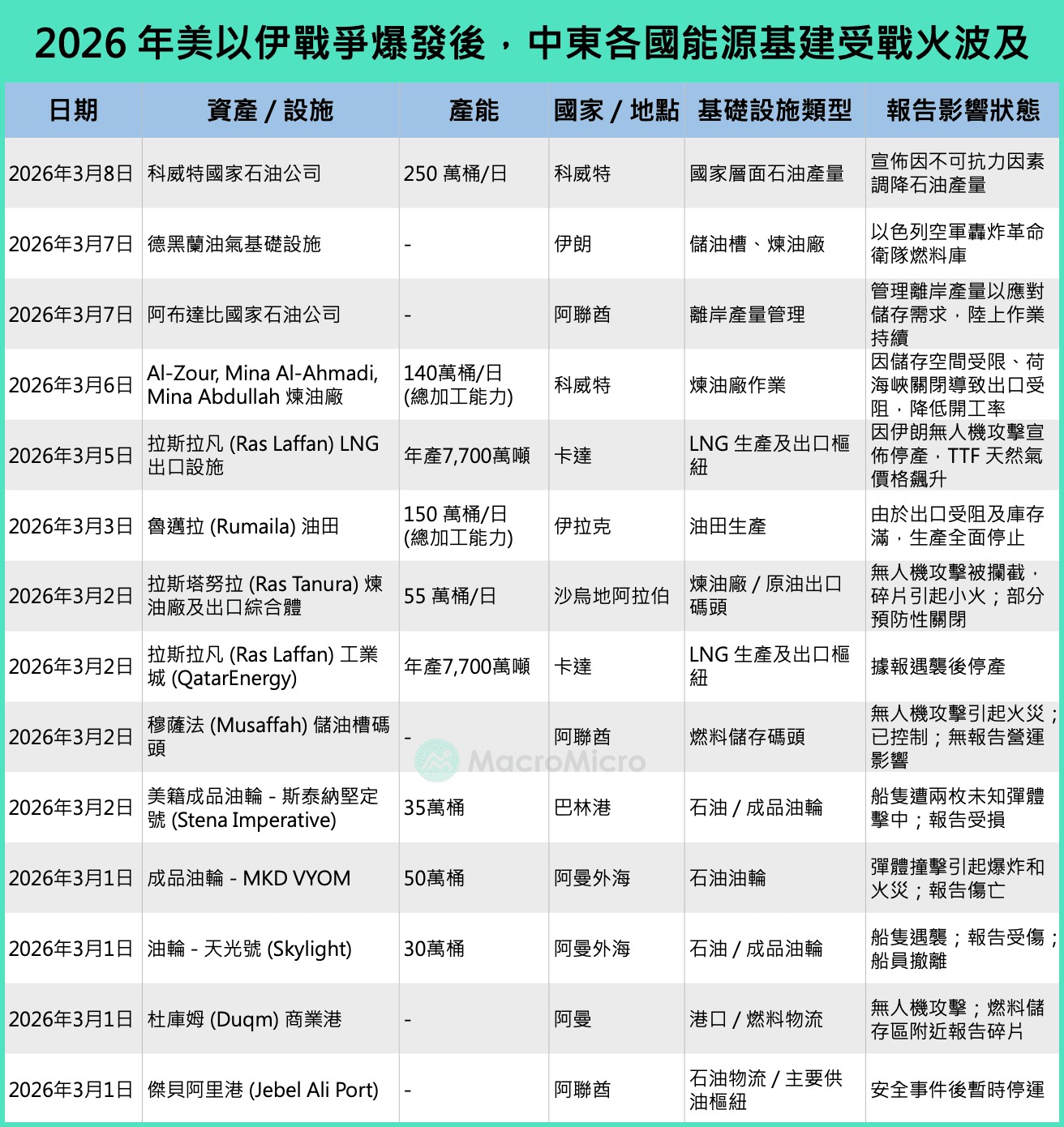 В отличие от конфликта в Июне 2025 года, в этот раз даже энергетическая инфраструктура не избежала ударов. В таблице ниже приведены объекты, подвергшиеся атакам за последнюю неделю: международные нефтяные танкеры (более 5), нефтеперерабатывающий завод Ras Tanura в Саудовской Аравии, экспортные объекты сжиженного природного газа Ras Laffan в Катаре, а также коммерческие порты в ОАЭ и Оман. США и Израиль также нанесли воздушные удары по нескольким энергетическим объектам в Тегеране, включая крупные нефтебазы и военные НПЗ в районах Шахрлан, Шахреи и Нобернияд. Согласно информации Axios, администрация Трампа рассматривает возможность контроля острова Харк, который отвечает за 90% нефтяных экспортов Ирана. Его отключение может дополнительно снизить поставки примерно на 1,5 миллиона баррелей в день, что особенно скажется на местных нефтеперерабатывающих заводах Китая.