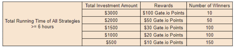 2. Users can create several strategies during the event. But the total running time needs to be no less than 6 hours, with a total minimum investment amount of 500 USDT.
