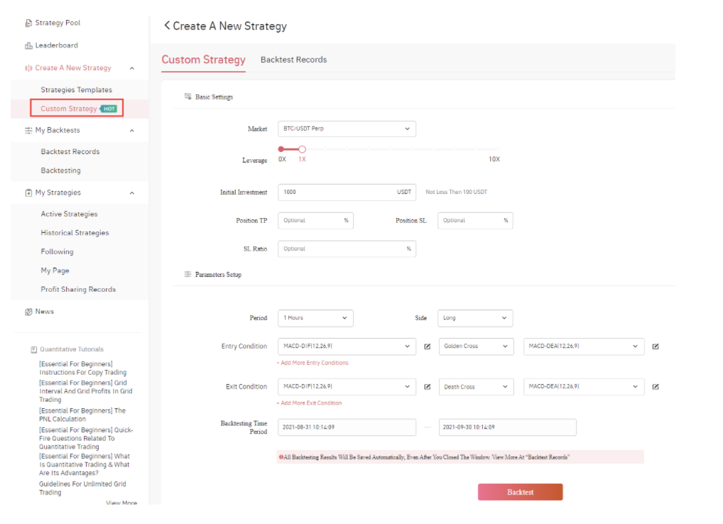 Gate welcomes more professional users to become signalers by creating strategies. In the "Create New Strategy" section, users can create their own custom strategies for free. Users are required to fill in the parameters and run backtesting first. After backtesting, users can create their strategy through Backtest Records.