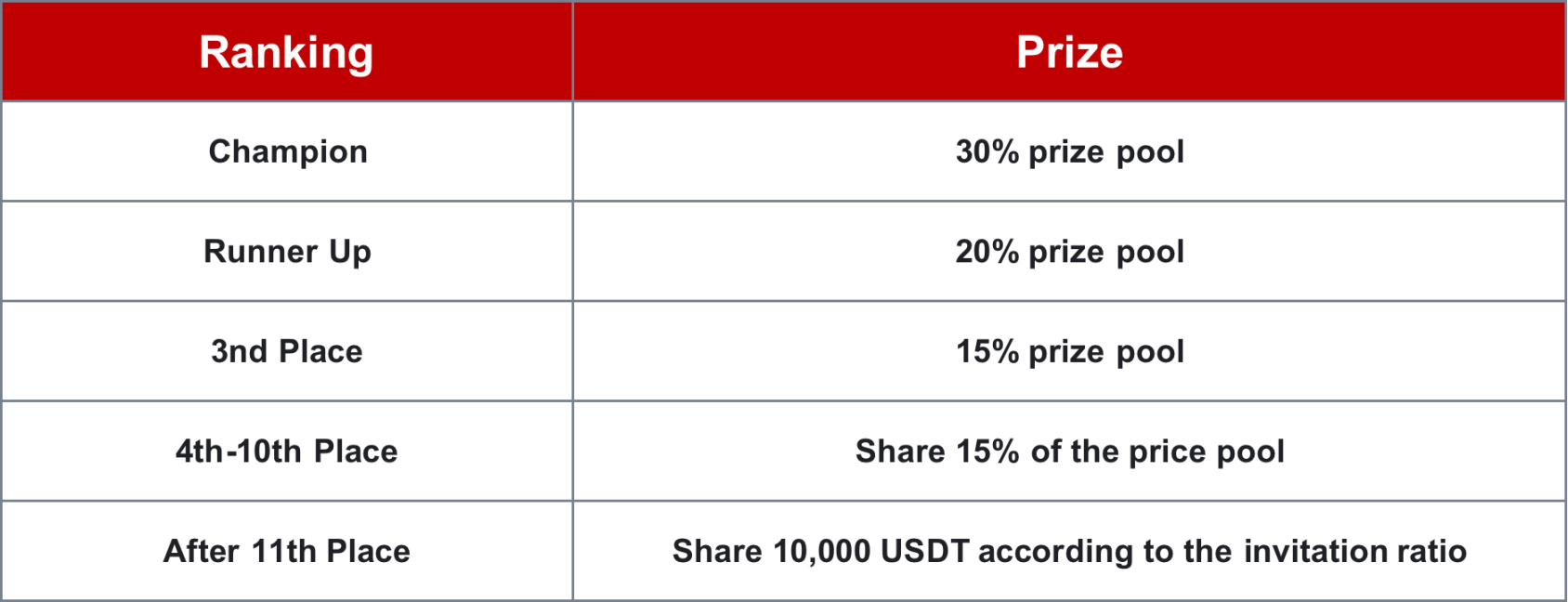 During the event, the base prize pool will start at 0.3 BTC. As the number of old users inviting new users increases, the entire prize pool will dynamically grow starting from 0.3 BTC, up to 1 BTC. In the end, we will rank the old users and divide the rewards according to the number of new users that the old users have successfully invited. The specific distribution is as follows: