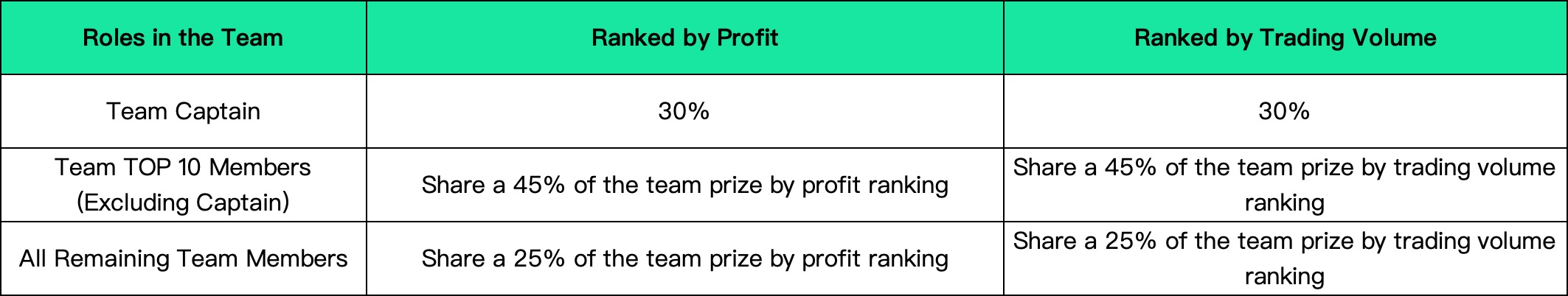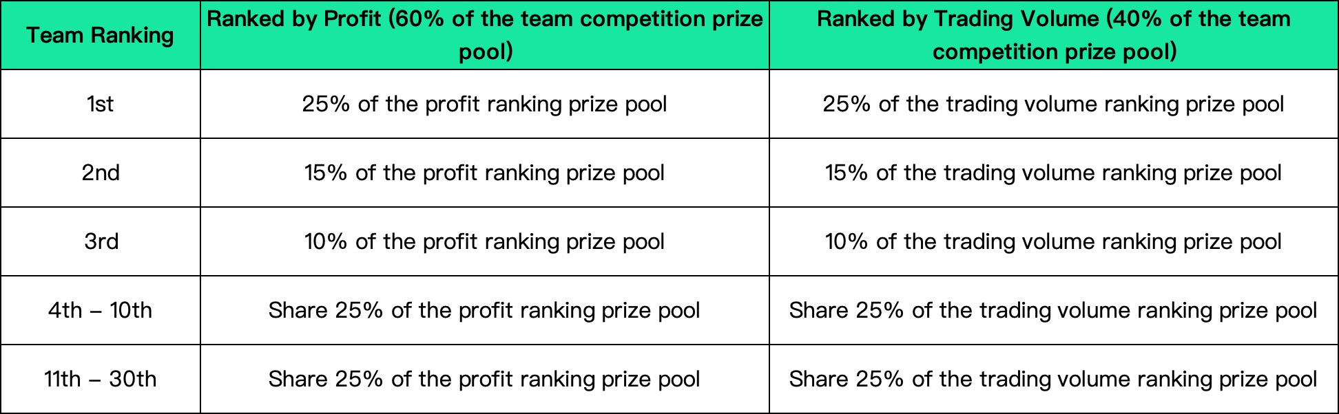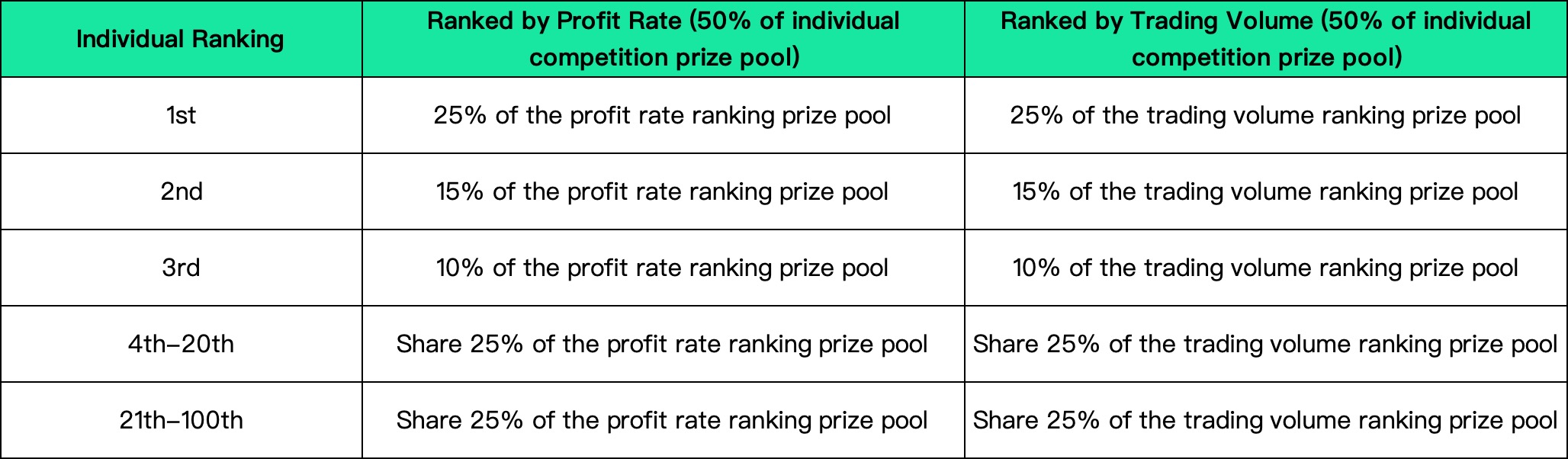 During the competition, users who participate in the individual competition will be ranked according to profit rate and trading volume respectively. Among them, those profit rate rankings account for 50% of the individual competition prize pool, and those trading volume rankings account for 50% of the individual competition prize pool. The details are as follows: