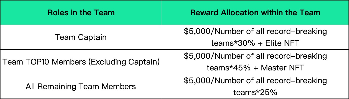 (a) At the end of the competition, all teams that break the 2022 WCTC S1 team trading volume record will share $5,000 prize pool equally and have a chance to win an exclusive NFT. The winning team in the record-breaking competition will have its awards distributed within the team according to the following rules: