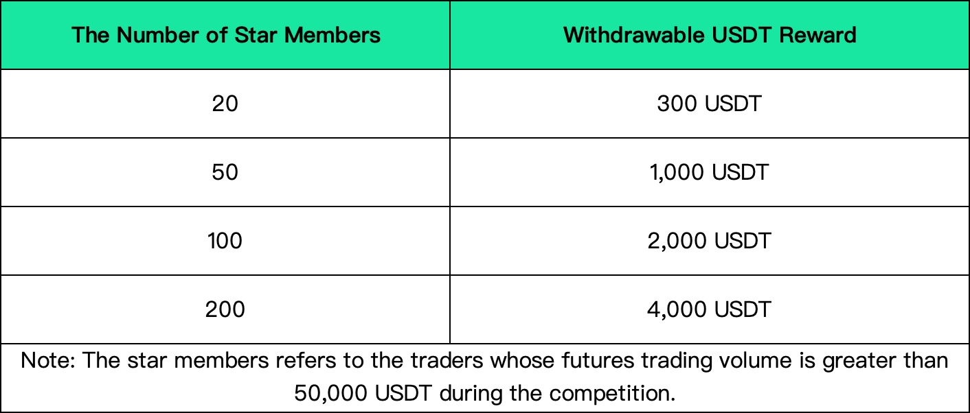 When the number of star members reaches a certain scale, the team captain will receive an additional USDT reward, up to a maximum of 4,000 USDT. The details are as follows: