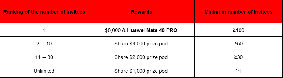 Rank and reward distribution according to the number of valid new users invited. The details are as follows: