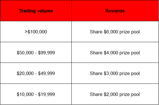 New users with high trading volume will receive prizes according to the following table: