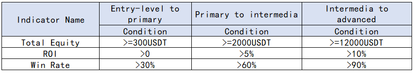 <1>Traders of the same level can be directly and automatically upgraded once they rank Top 3 in three or more indicators of the six: [Total Equity], [AUM], [ROI], [ROI Amount], [Maximum Drawdown Rate], [Win Rate].