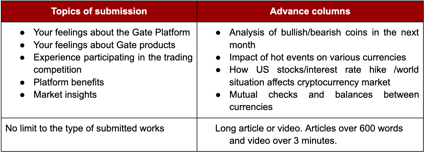 Users will have the opportunity to win prizes once they submit their work. We will randomly select 20 lucky fellows from the users who submit their works every week to give them a participation prize of $5-10 equivalent, including tokens, bonuses, points, etc; Every time you complete a selected column, you will have a chance to get $50~200 random tokens in rewards. In addition, if committed to contributing to the creation for a long time, you can get a Crypto Expo presence, Gate goods, random tokens, and other lucrative rewards.