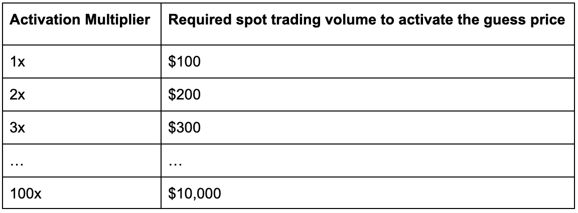 1.Participants need to complete the required trading volume before the closing time, 23:59 (UTC) each day; if participants submit multiple prices, the guess price will be activated in chronological order of submission time.