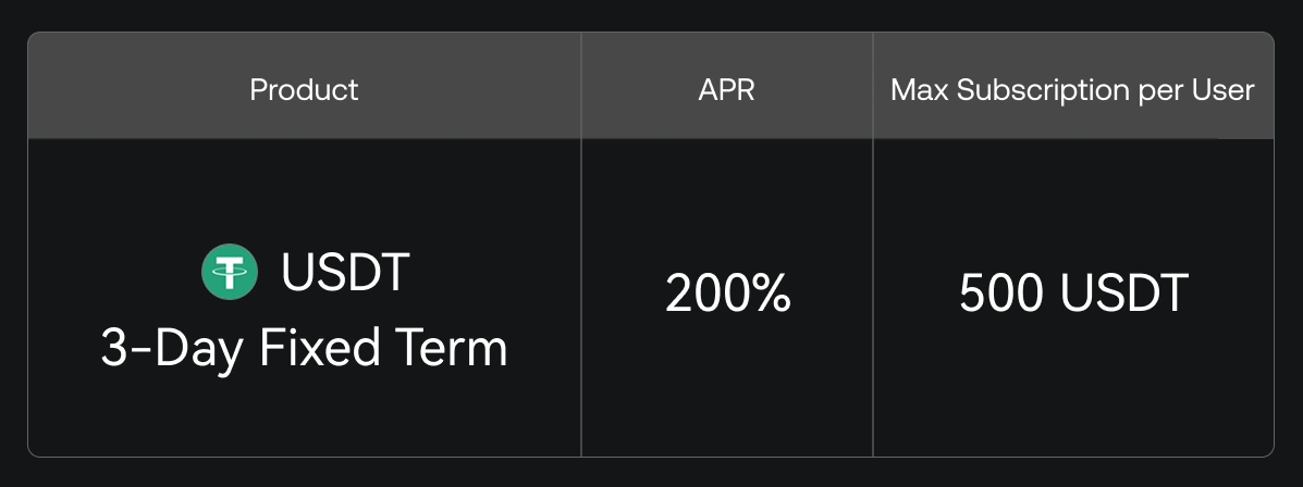 Users who have not used Simple Earn before the event can enjoy a 200% annualized return by subscribing to a 3-day Fixed Term Earn in USDT.