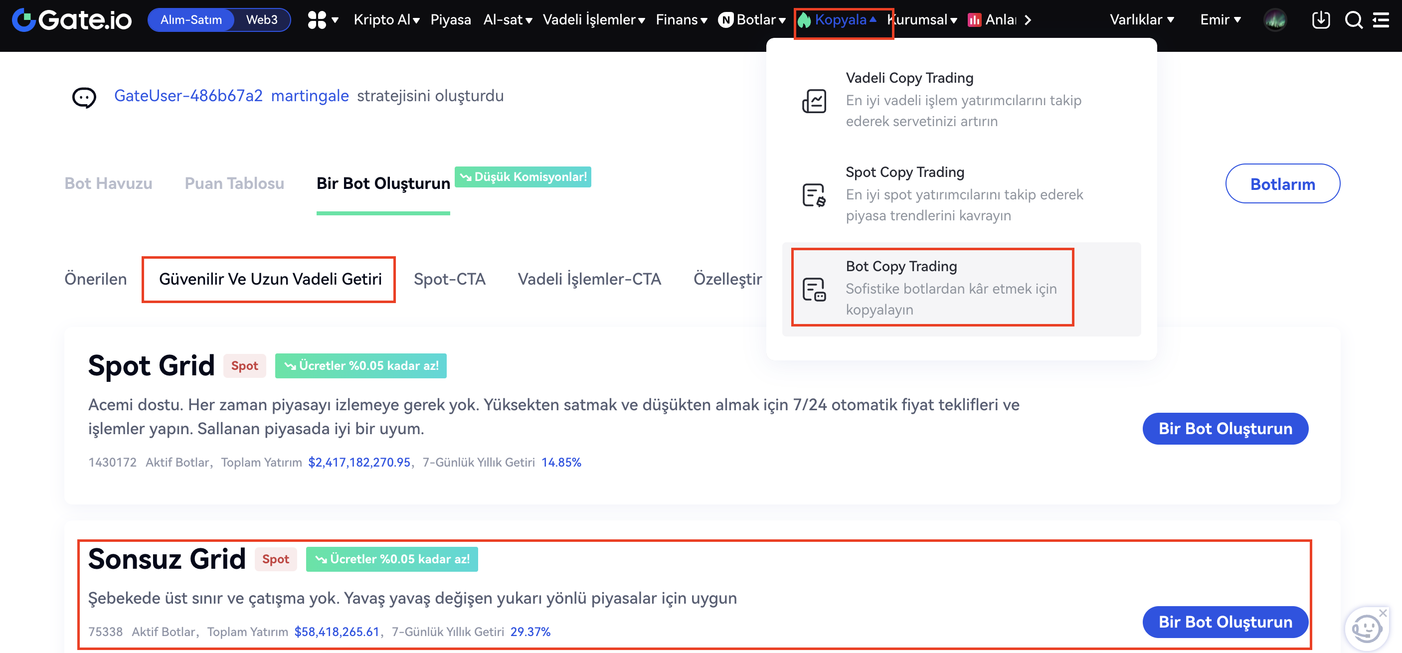 Gezinme çubuğu - " Copy Trading "-" Strateji Botu "-" Strateji Oluştur "-" Tavsiye Et "-"Akıllı Yeniden Dengeleme "-"Strateji Oluştur". Ardından işlem çiftini seçin, parametreleri ayarlayın ve "Oluştur" a tıklayın. Aşağıdaki şekilde gösterildiği gibi: