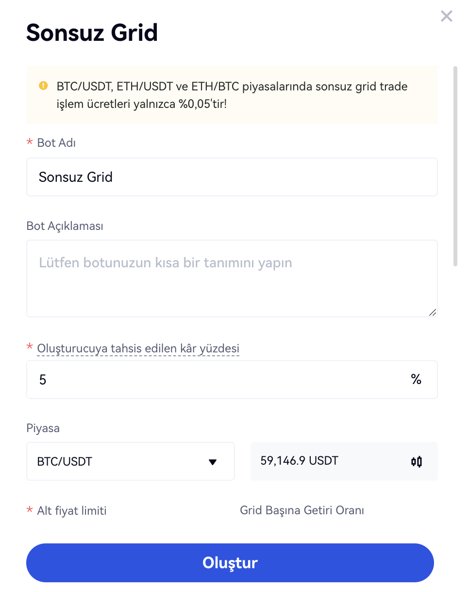 Grid başına getiri oranı: Bir grid gerçekleştirildikten sonraki getiri oranı (işlem ücreti dahil). Grid başına getiri oranı 0,4'ten büyük ve 100'den küçük olmalıdır.