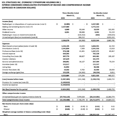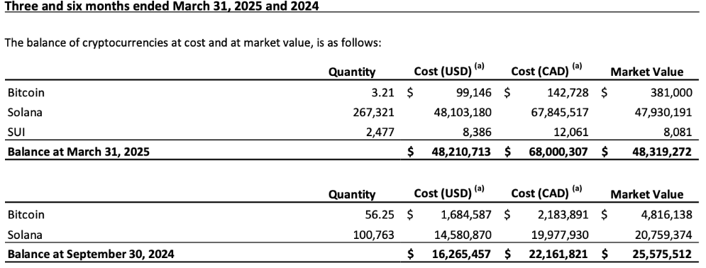 ! SOL Strategies'in kazanç raporundan | Kaynak: SOL StrategiesSOL Strategies, Nisan ayında daha fazla SOL ve SUI biriktiren ancak Bitcoin varlıklarını önemli ölçüde azaltan 500 milyon dolarlık dönüştürülebilir tahvil ihraç ettiğini duyurdu. Genel olarak, şirket tarafından tutulan kripto değeri 31 Mart itibariyle 48,3 milyon Kanada doları (35,2 milyon USD) idi.