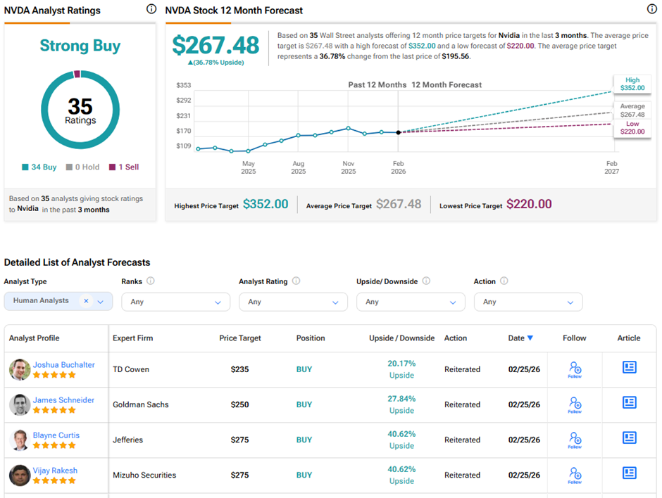 On TipRanks, Nvidia stock commands a Strong Buy consensus rating based on 34 Buys and one Sell rating. The average Nvidia price target of $267.48 implies 36.8% upside potential from current levels. Over the past year, NVDA shares have surged 49%.